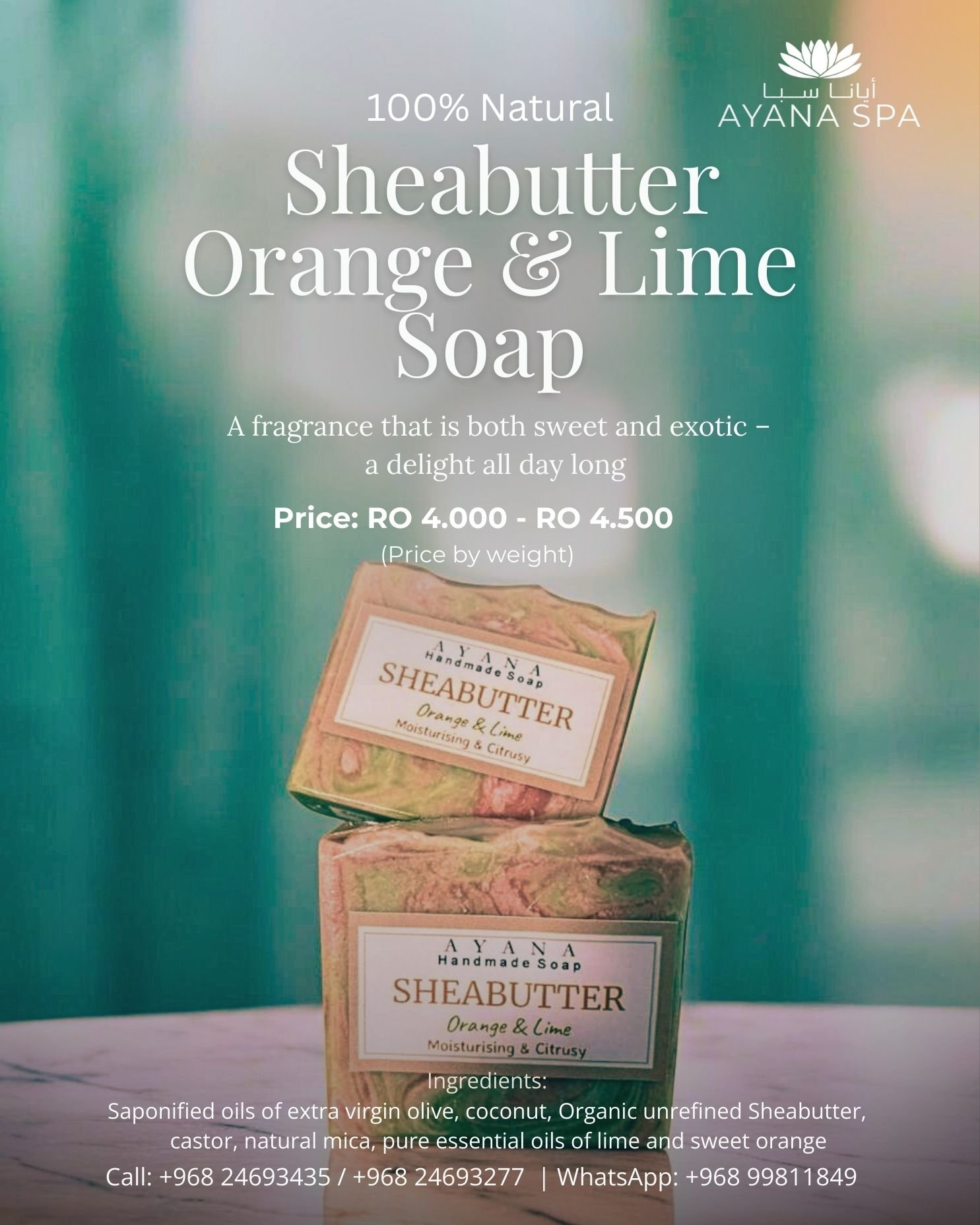 OUR TREATMENTS Massages – Body Therapy – Body Spa – Signature Body Spas – Moroccan Rituals - Facial Treatments – Body Contour & Reshaping – Nail Spa – Hair Treatments – Threading & Waxing OUR HANDMADE SOAPS Ayana Spa has created their own range of organic and natural handmade soaps. This collection is free of all harsh chemicals and cruelty free so that you can enjoy the purest collection of locally made soaps for your skin and your families skin.